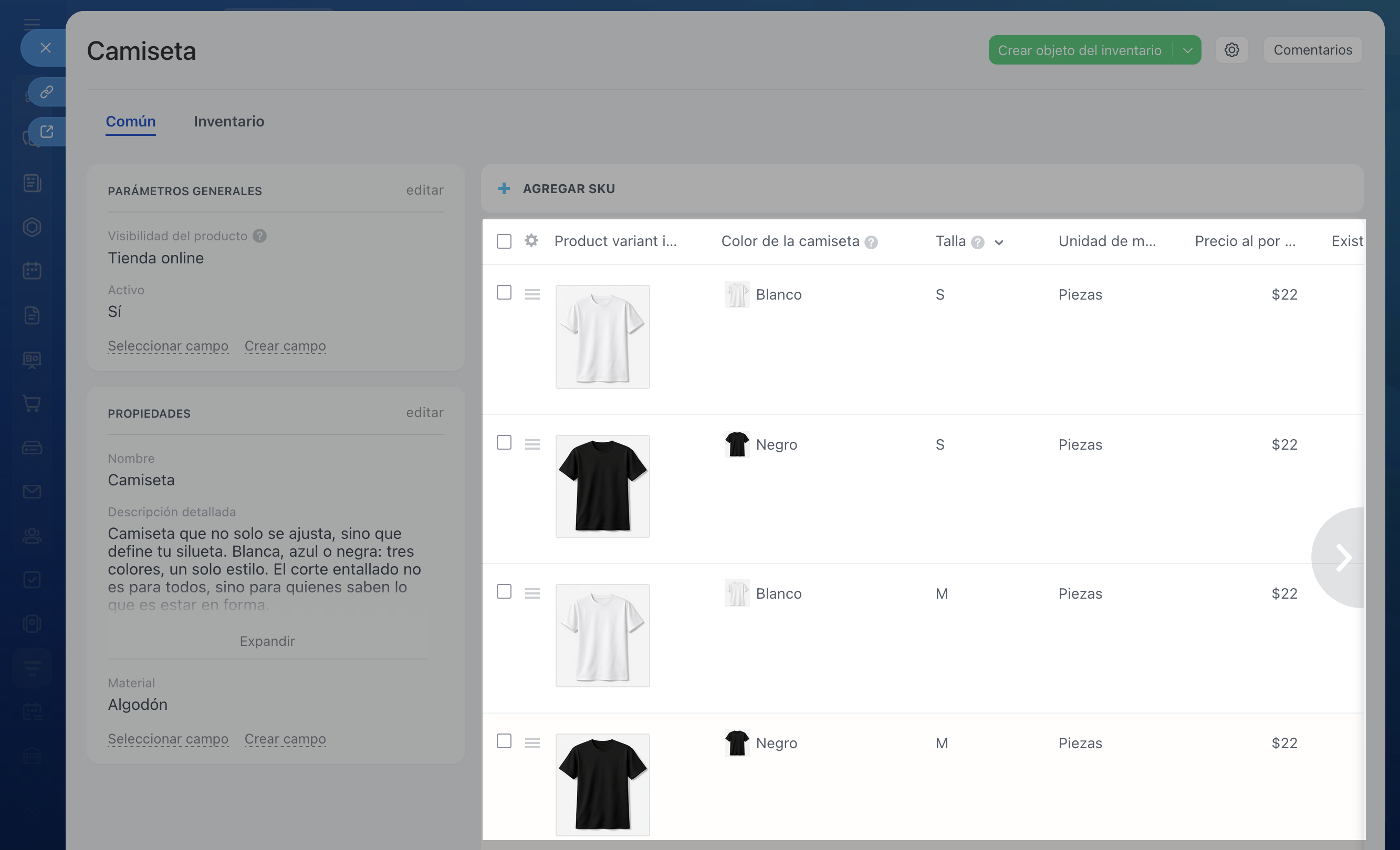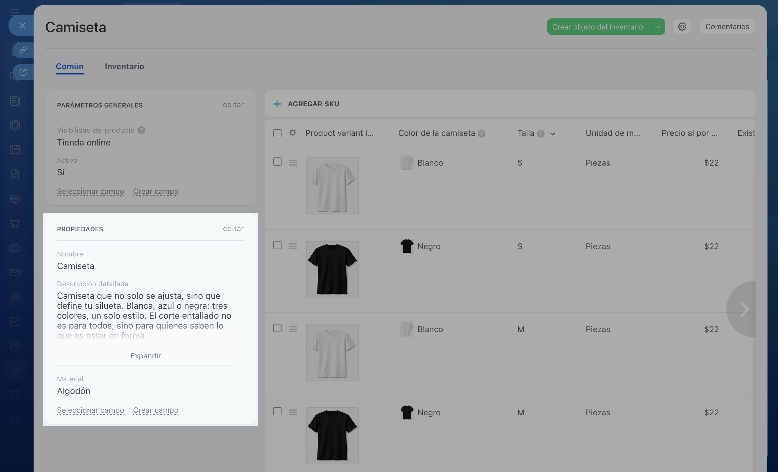 En Bitrix24, las propiedades son campos con información sobre el producto. Por ejemplo, puedes añadir el campo Material o Tipo de matriz. Si el producto tiene varias opciones —por ejemplo, diferentes tallas o colores— utiliza las variantes.