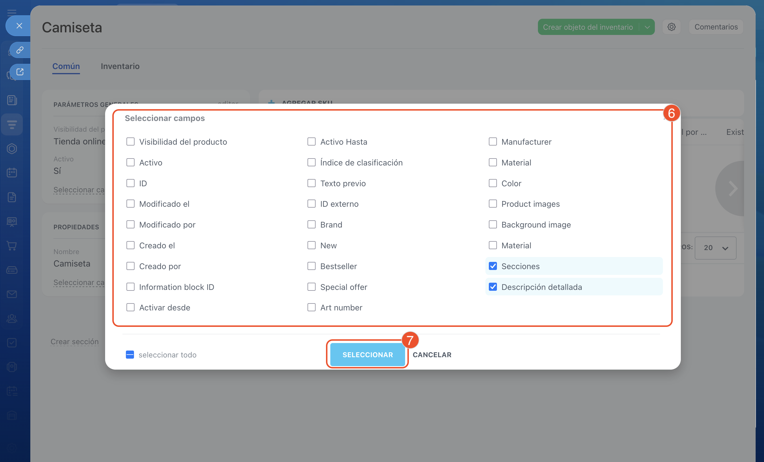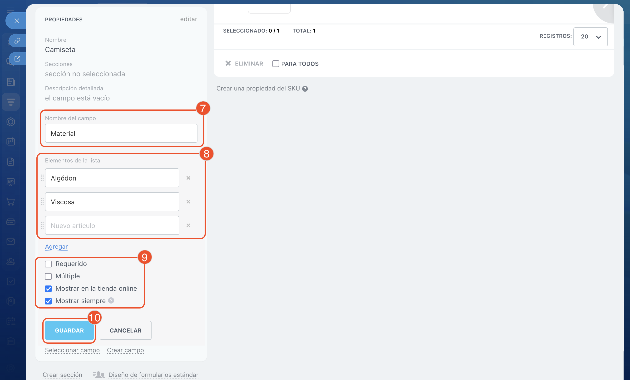 Después de configurar las propiedades, puedes elegir cómo se mostrarán en la ficha y en la lista de productos.