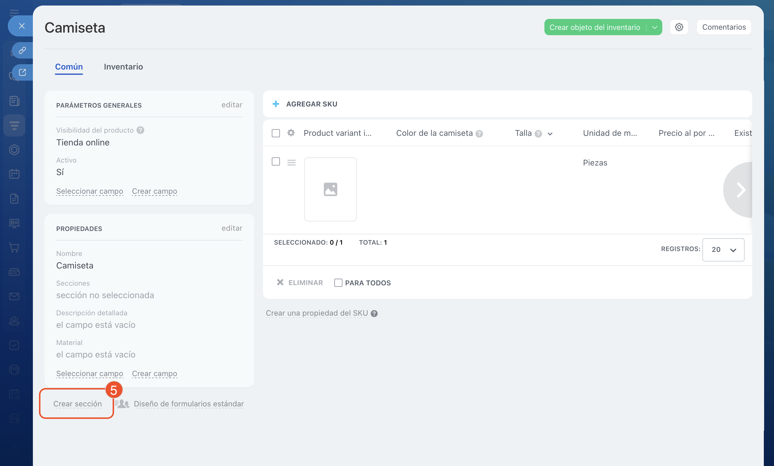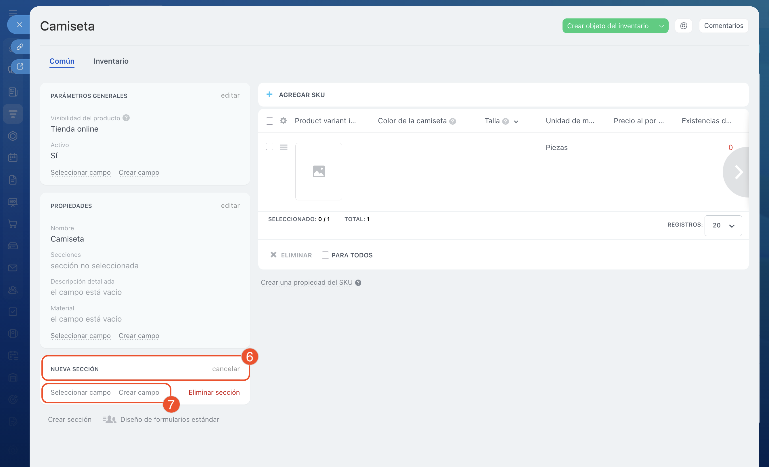 - Puedes agrupar las propiedades en secciones. Para ello, en la ficha del producto haz clic en Crear sección. En ella puedes añadir campos existentes o crear nuevos.