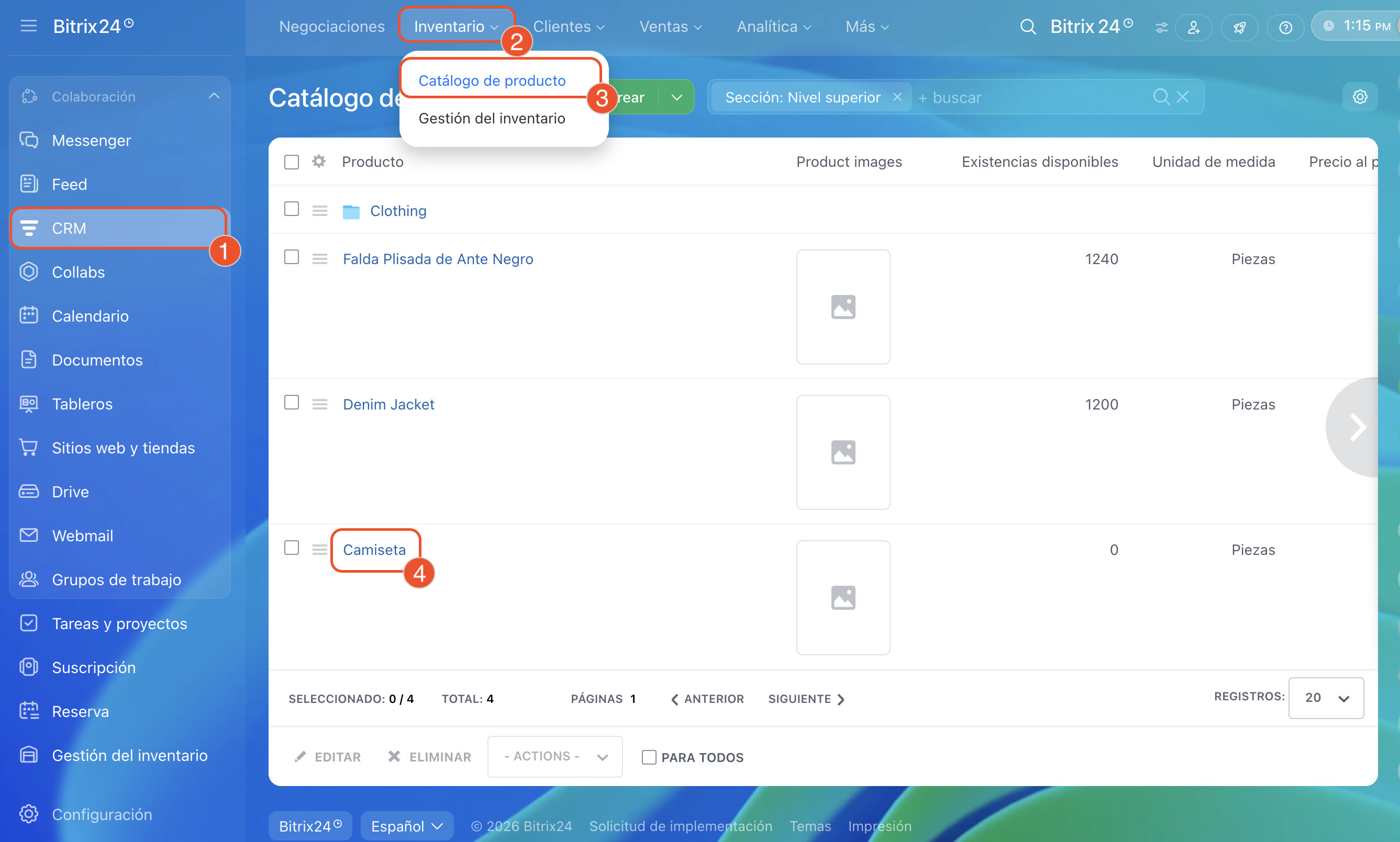 1–3. Ve a CRM > Inventario > Catálogo de producto.
