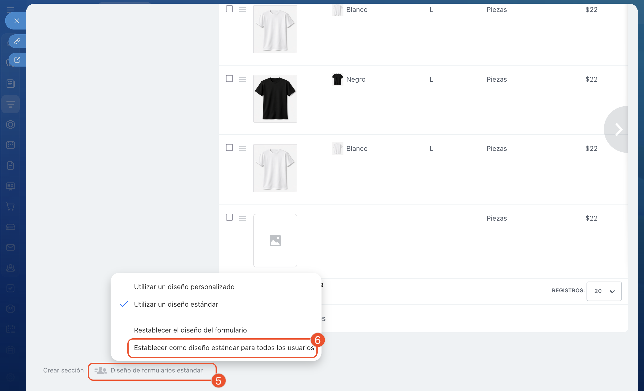 - La vista estándar de la ficha para todos los empleados se configura en la ficha del producto: haz clic en Diseño de formularios estándar > Establecer como diseño estándar para todos los usuarios.