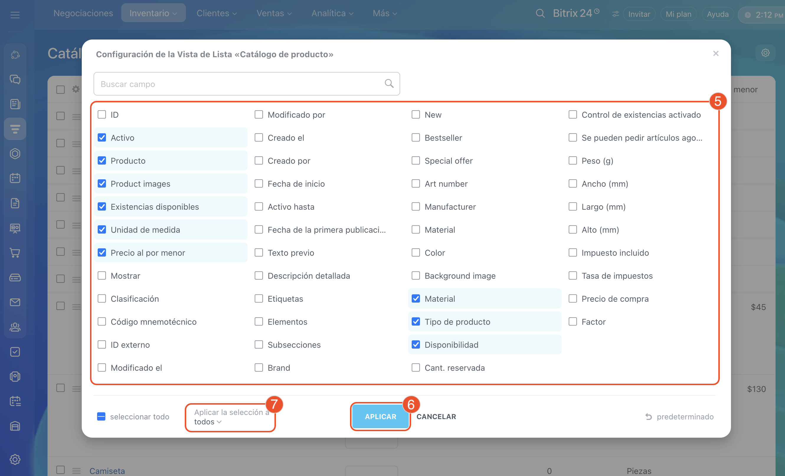- Para ver las propiedades en la lista de productos, ve a CRM > Inventario > Catálogo de producto. Haz clic en Configuración (⚙️) y selecciona los campos necesarios. Luego haz clic en Aplicar.