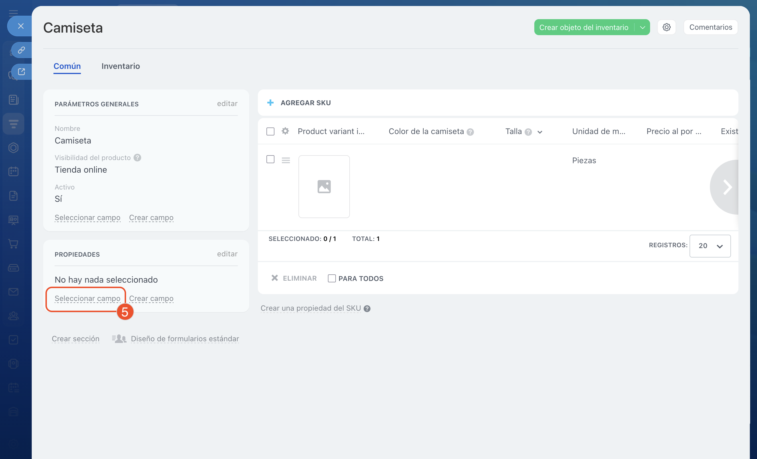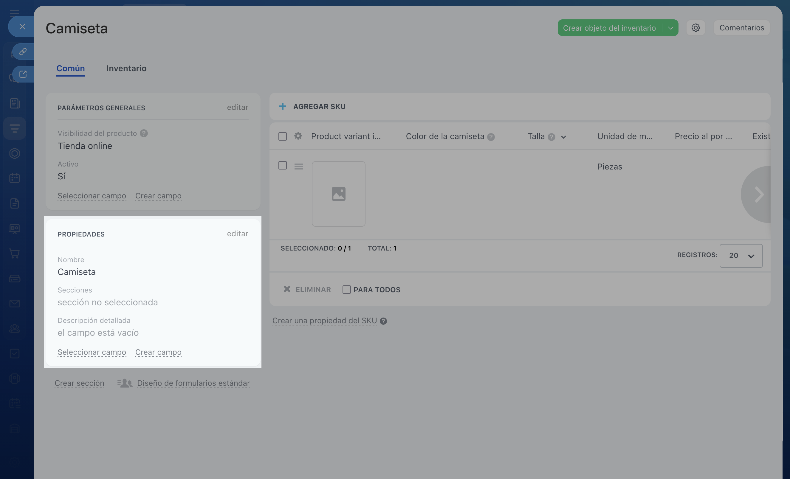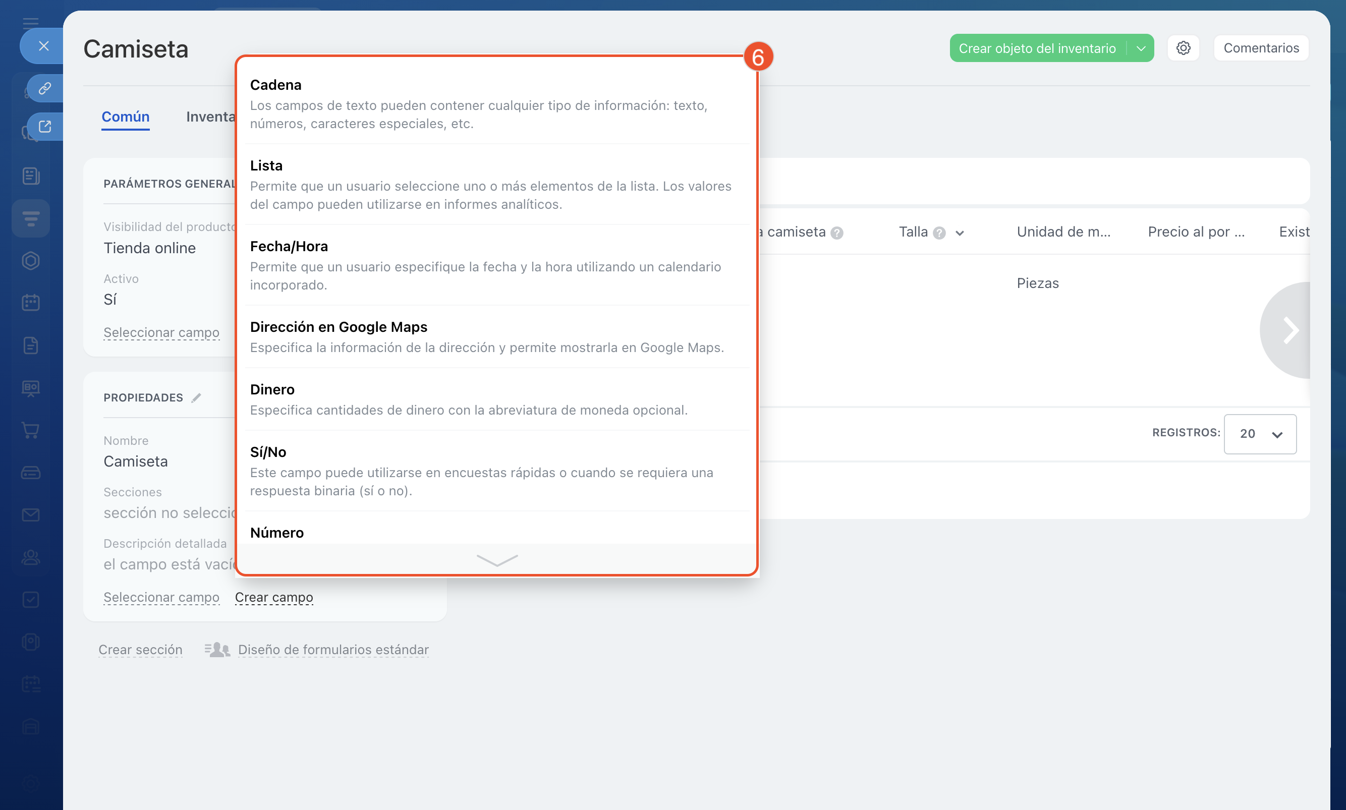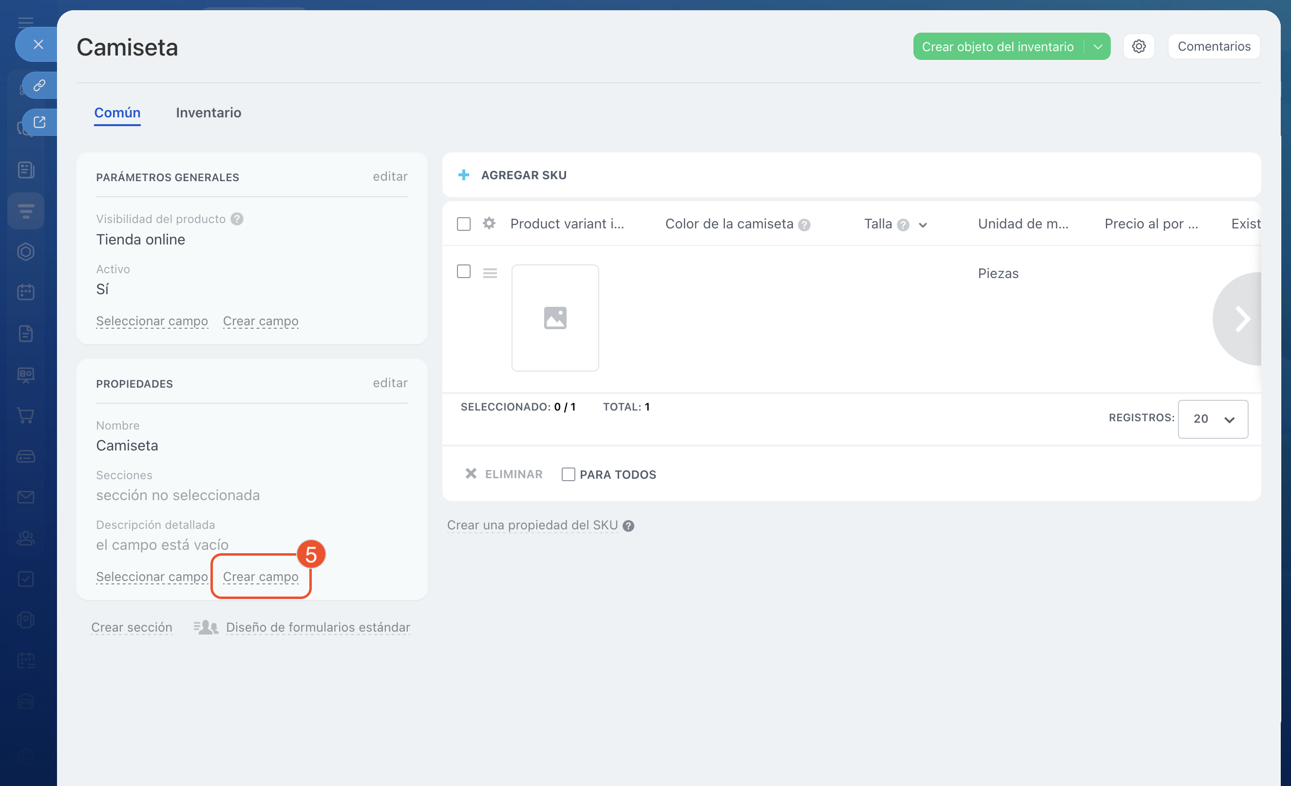 - Para añadir una propiedad, ve a CRM > Inventario > Catálogo de producto. Selecciona un producto y haz clic en Crear campo.