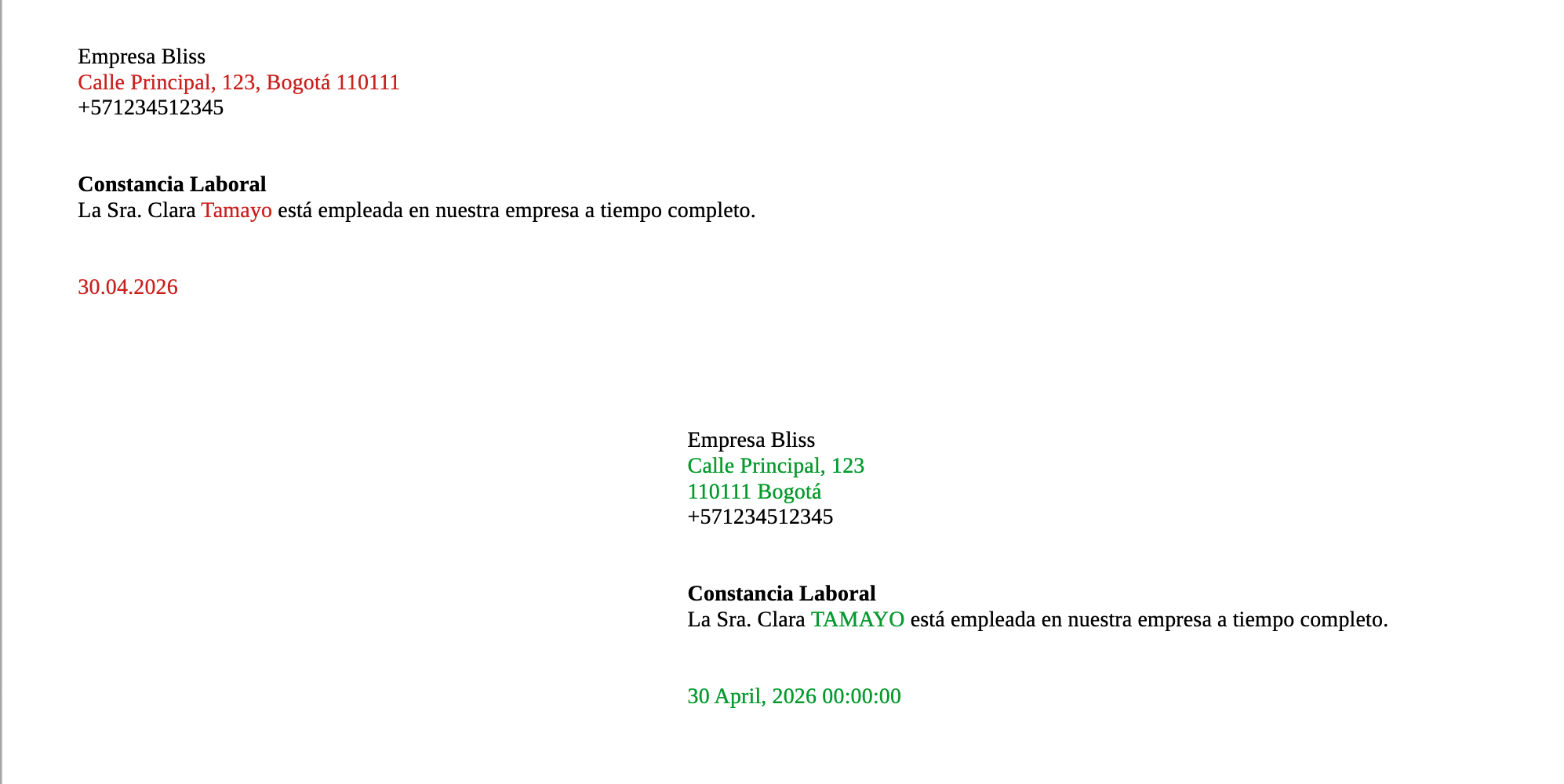 El código será {User.Emp.LastName~letterCase=upper}. En el documento, el apellido se mostrará en mayúsculas. Por ejemplo, TORRES en lugar de Torres.