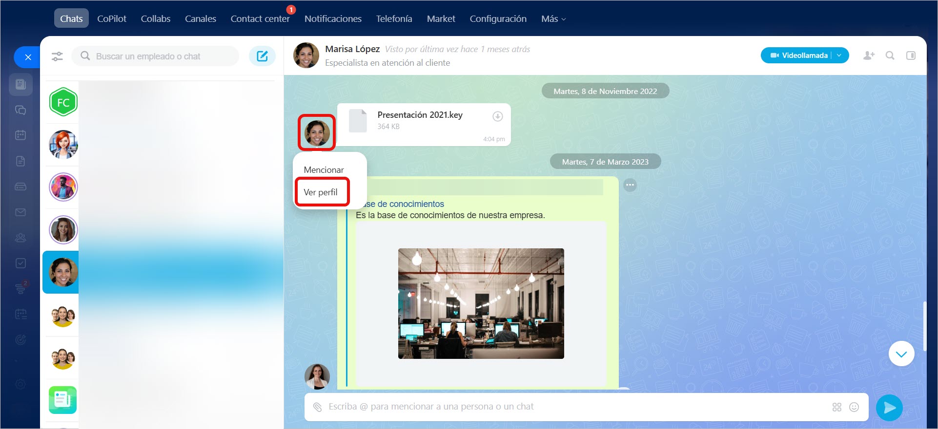 Para acceder al perfil de un empleado, haz clic en su foto en el chat, una tarea u otra herramienta de Bitrix24.