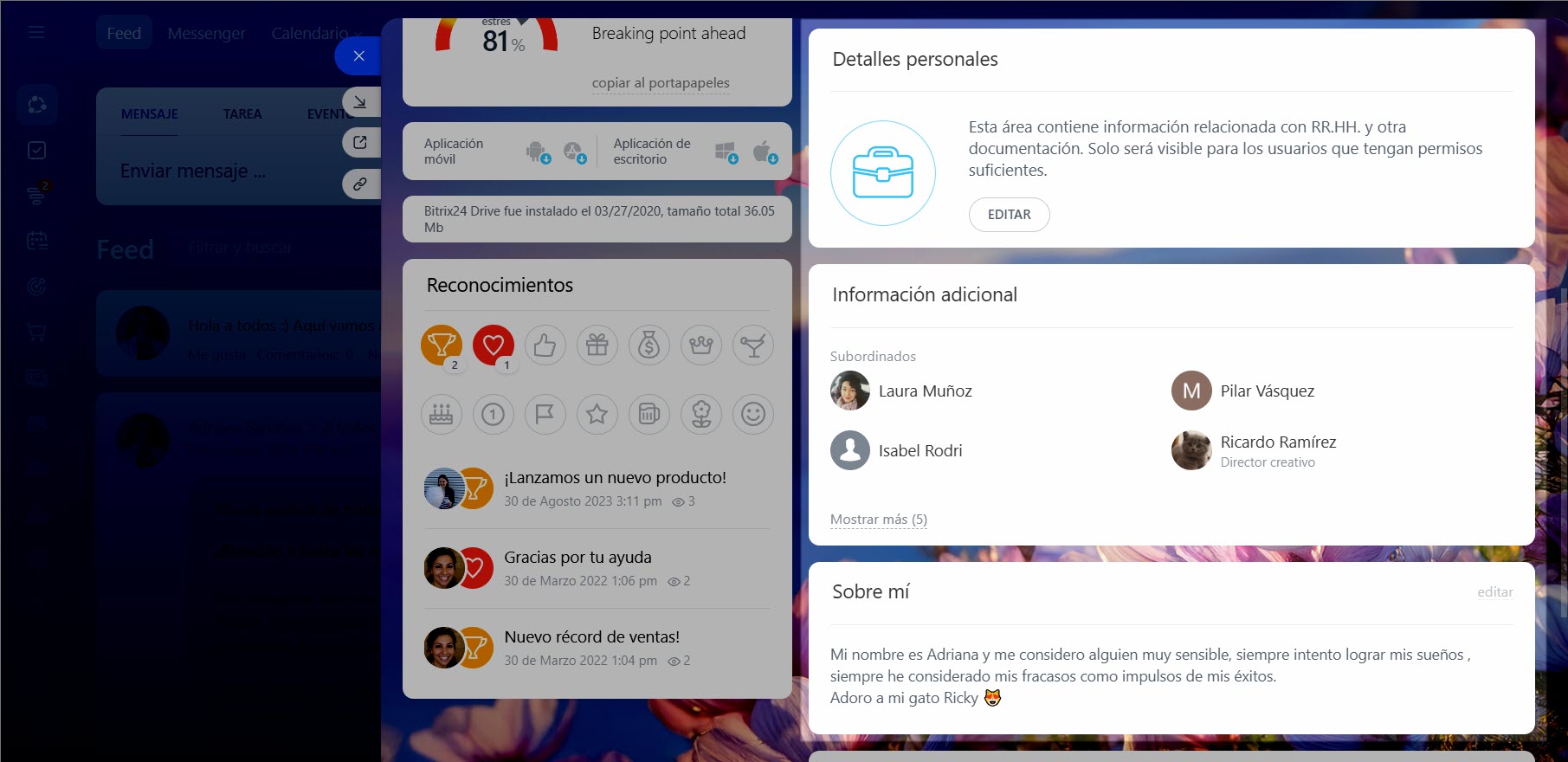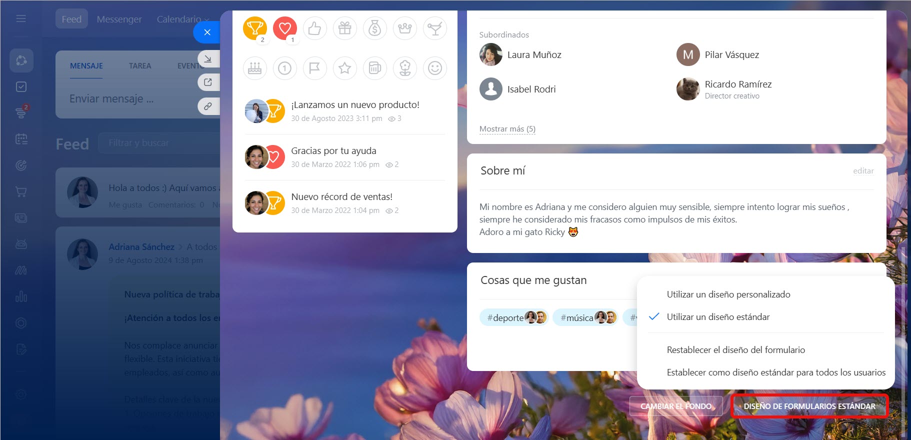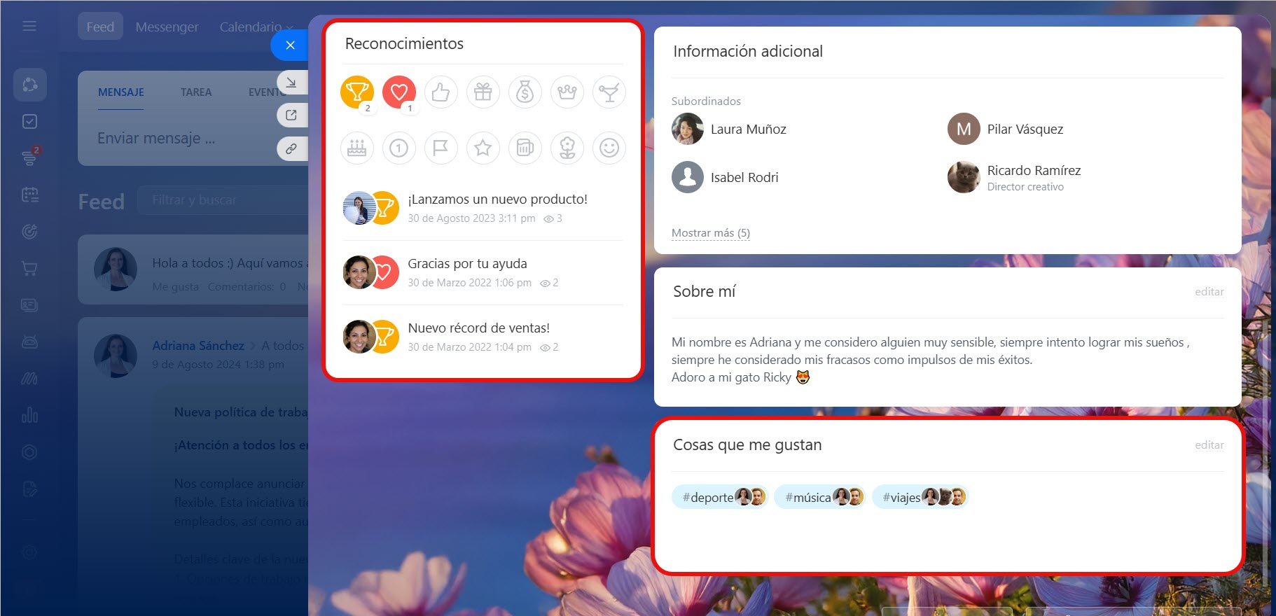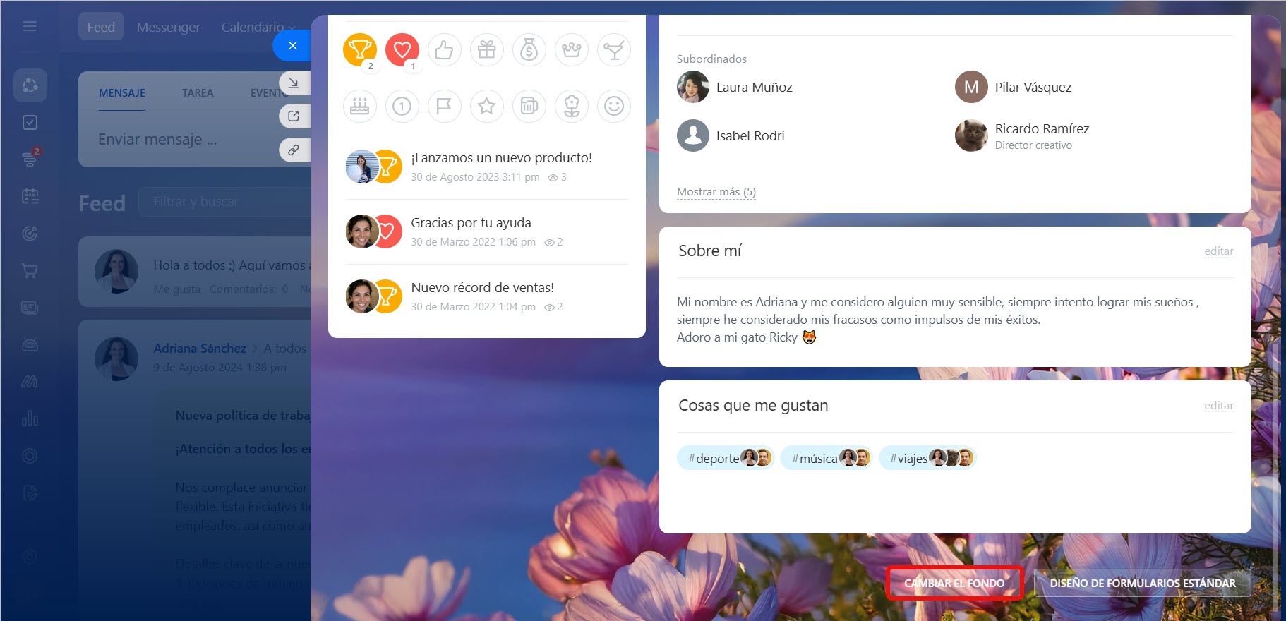 Sobre mí. Cualquier información que el empleado desee compartir con sus compañeros. Por ejemplo, hablar sobre sus hobbies o compartir fotos de viajes.