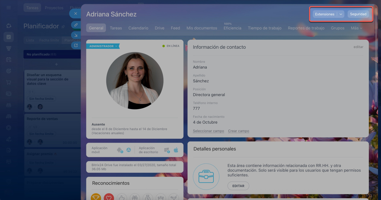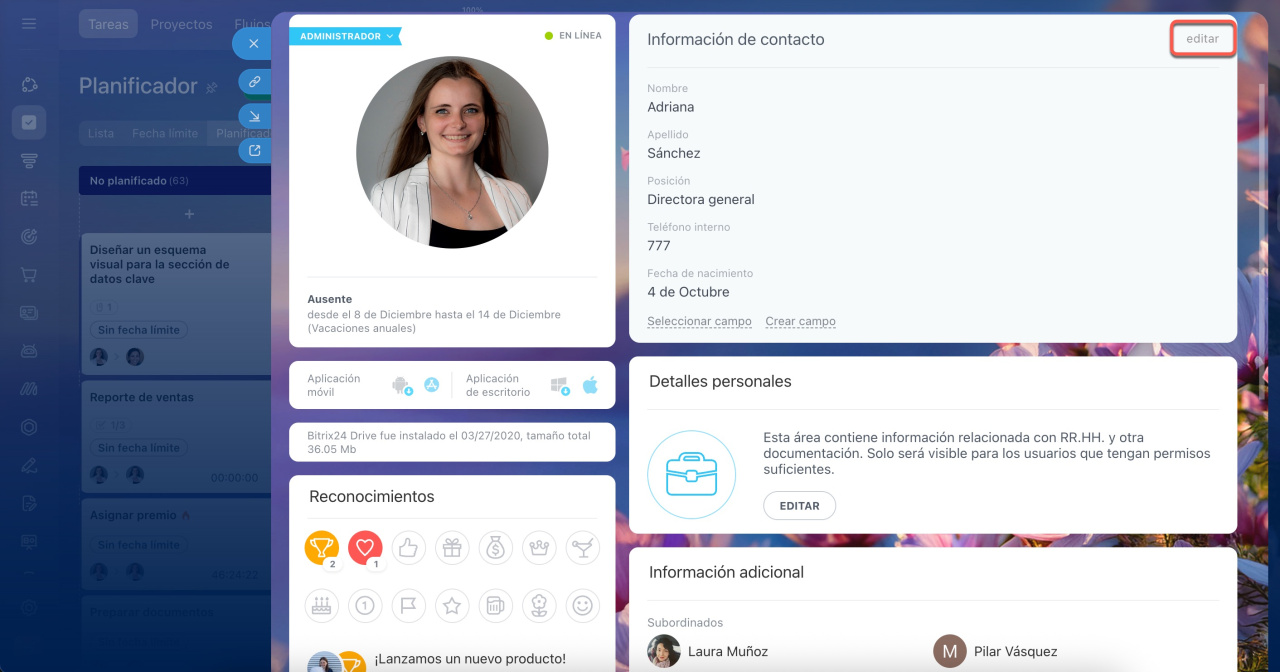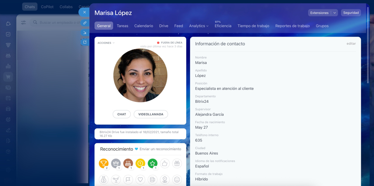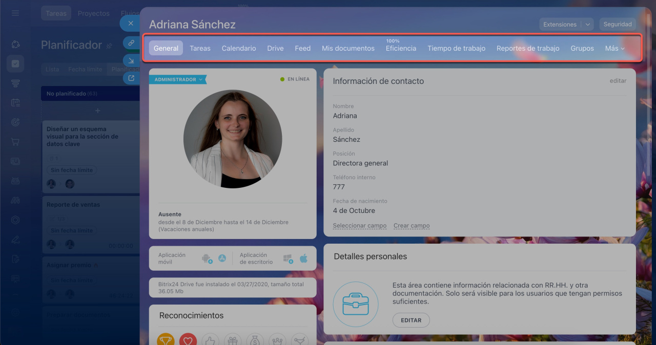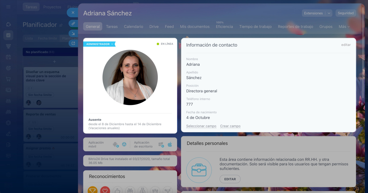 - Puedes acceder al perfil de cualquier empleado tanto desde la versión web como desde la aplicación móvil de Bitrix24.
